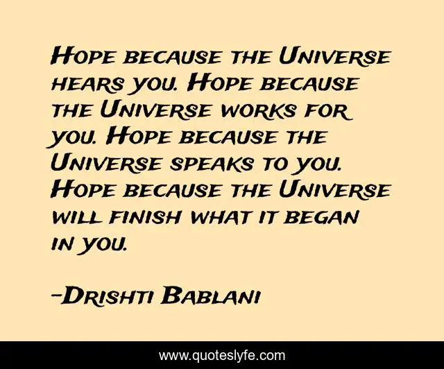 "Drishti Bablani Quotes." Quoteslyfe.com, 2025. Fri. 05 Dec. 2025. <https://www.quoteslyfe.com/quote/Hope-because-the-Universe-hears-you-Hope-19790>.