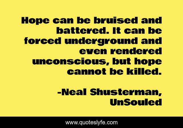 This page presents the quote "Hope can be bruised and battered. It can be forced underground and even rendered unconscious, but hope cannot be killed.". Author of this quote is Neal Shusterman, UnSouled. This quote is about behaviour, enthusiasm, attitude, inspirational, life-lessons,.