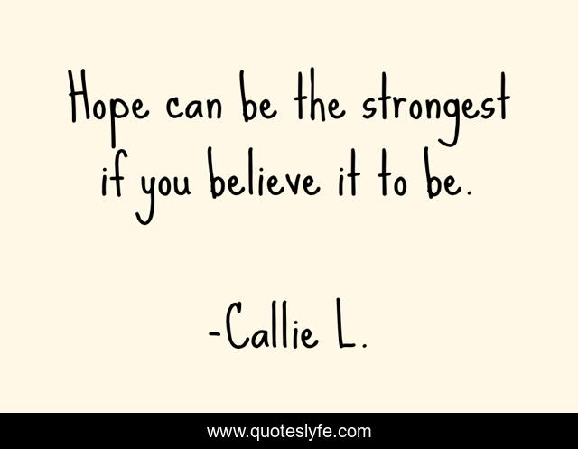 This page presents the quote "Hope can be the strongest if you believe it to be.". Author of this quote is Callie L.. This quote is about quotes, life, hope, inspirational, enthusiasm,.
