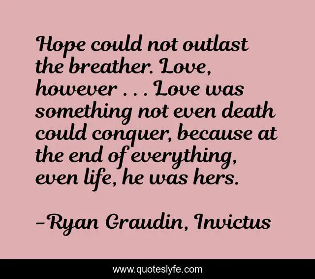 This page presents the quote "Hope could not outlast the breather. Love, however . . . Love was something not even death could conquer, because at the end of everything, even life, he was hers.". Author of this quote is Ryan Graudin, Invictus. This quote is about death, love, hope, affection,.