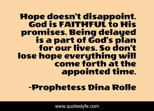 This page presents the quote "Hope doesn't disappoint. God is FAITHFUL to His promises. Being delayed is a part of God's plan for our lives. So don't lose hope everything will come forth at the appointed time.". Author of this quote is Prophetess Dina Rolle. This quote is about appointed-time, god-s-plan, faithful, hope,.