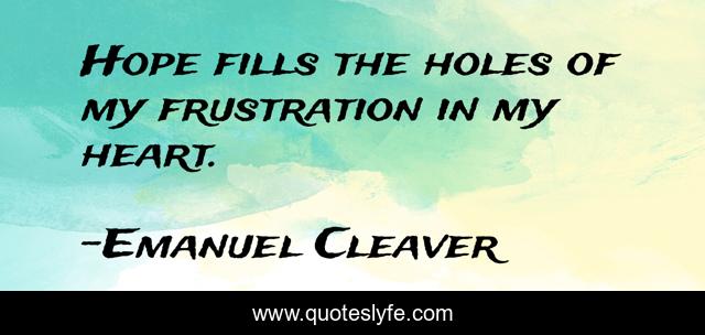 This page presents the quote "Hope fills the holes of my frustration in my heart.". Author of this quote is Emanuel Cleaver. This quote is about heart, frustration, fills,.