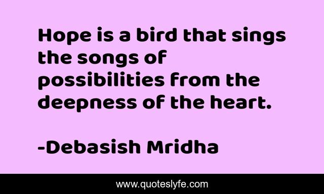 This page presents the quote "Hope is a bird that sings the songs of possibilities from the deepness of the heart.". Author of this quote is Debasish Mridha. This quote is about heart, possibillities, philosophy, debasish-mridha, hope-is-a-bird, quotes, debasish-mridha-md, inspirational, enthusiasm,.