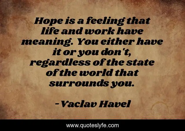 This page presents the quote "Hope is a feeling that life and work have meaning. You either have it or you don't, regardless of the state of the world that surrounds you.". Author of this quote is Vaclav Havel. This quote is about world, life, work,.