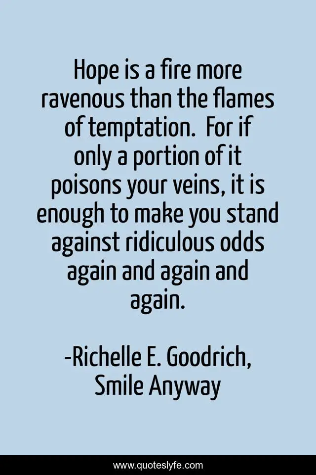 This page presents the quote "Hope is a fire more ravenous than the flames of temptation. For if only a portion of it poisons your veins, it is enough to make you stand against ridiculous odds again and again and again.". Author of this quote is Richelle E. Goodrich, Smile Anyway. This quote is about desire, belief, temptation, trials, richelle, richelle-goodrich, hope,.