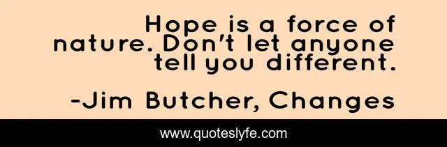 This page presents the quote "Hope is a force of nature. Don't let anyone tell you different.". Author of this quote is Jim Butcher, Changes. This quote is about hope, harry-dresden,.