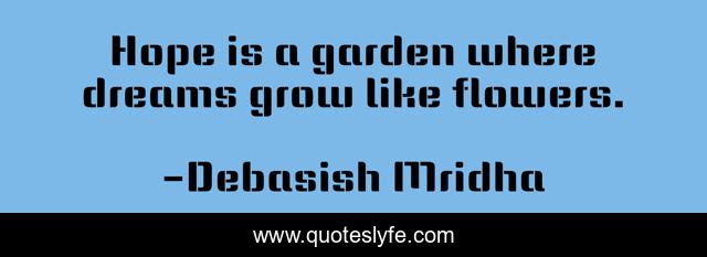 This page presents the quote "Hope is a garden where dreams grow like flowers.". Author of this quote is Debasish Mridha. This quote is about life, love, knowledge, inspirational, intelligence, philosophy, wisdom, affection, truth,.