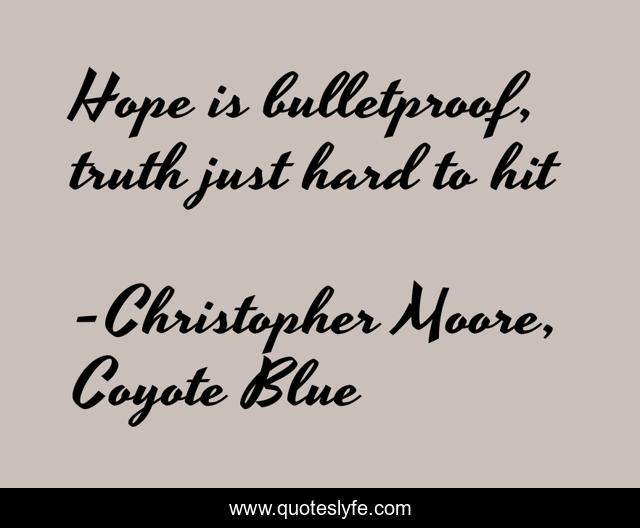 This page presents the quote "Hope is bulletproof, truth just hard to hit". Author of this quote is Christopher Moore, Coyote Blue. This quote is about bulletproof, hope, truth, christopher-moore,.