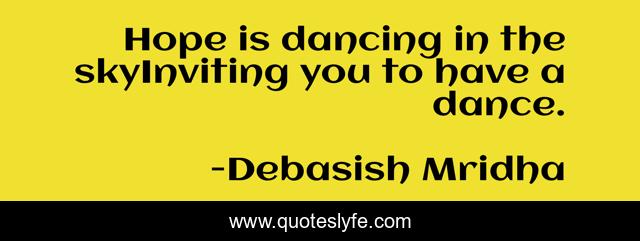 This page presents the quote "Hope is dancing in the skyInviting you to have a dance.". Author of this quote is Debasish Mridha. This quote is about life, love, knowledge, inspirational, intelligence, philosophy, wisdom, affection, truth,.