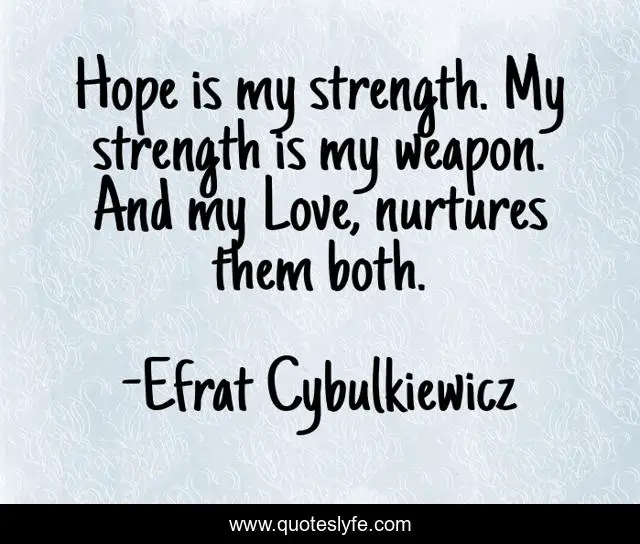 This page presents the quote "Hope is my strength. My strength is my weapon. And my Love, nurtures them both.". Author of this quote is Efrat Cybulkiewicz. This quote is about self-love, self-respect, love, strength-through-adversity, self-awareness, strenght, courge, nuturers, affection,.