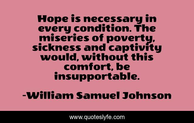 This page presents the quote "Hope is necessary in every condition. The miseries of poverty, sickness and captivity would, without this comfort, be insupportable.". Author of this quote is William Samuel Johnson. This quote is about comfort, poverty, sickness,.