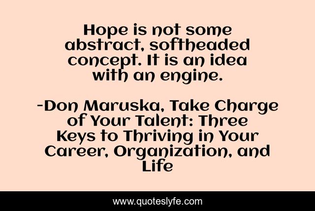 This page presents the quote "Hope is not some abstract, softheaded concept. It is an idea with an engine.". Author of this quote is Don Maruska, Take Charge of Your Talent: Three Keys to Thriving in Your Career, Organization, and Life. This quote is about talent, ideas, hope,.