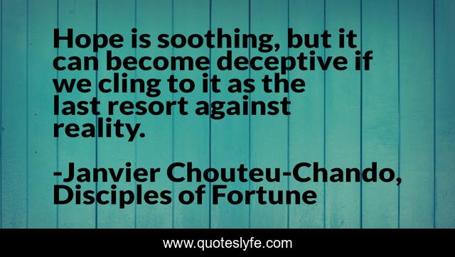 This page presents the quote "Hope is soothing, but it can become deceptive if we cling to it as the last resort against reality.". Author of this quote is Janvier Chouteu-Chando, Disciples of Fortune. This quote is about enthusiasm, life, hope, inspirational,.