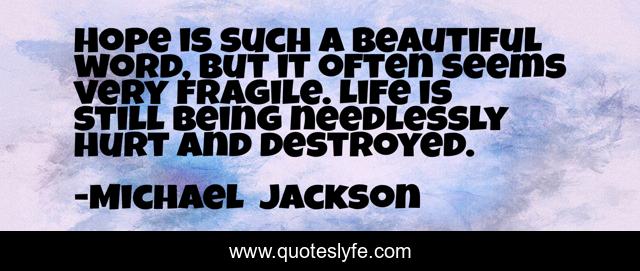 This page presents the quote "Hope is such a beautiful word, but it often seems very fragile. Life is still being needlessly hurt and destroyed.". Author of this quote is Michael Jackson. This quote is about life, hope,.