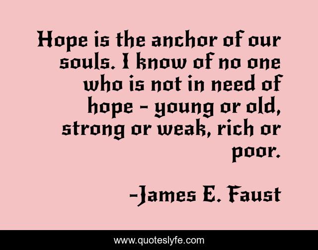 This page presents the quote "Hope is the anchor of our souls. I know of no one who is not in need of hope - young or old, strong or weak, rich or poor.". Author of this quote is James E. Faust. This quote is about strong, rich,.