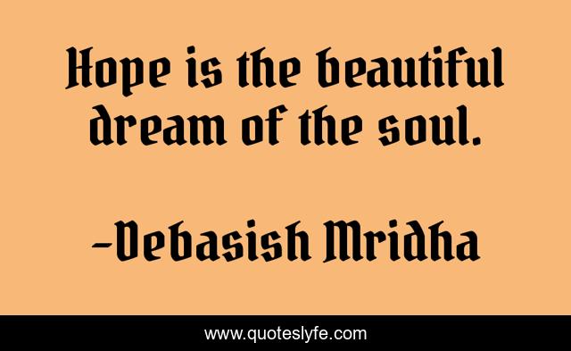 This page presents the quote "Hope is the beautiful dream of the soul.". Author of this quote is Debasish Mridha. This quote is about beautiful-dream, philosophy, debasish-mridha, soul, quotes, debasish-mridha-md, inspirational, enthusiasm, hope,.