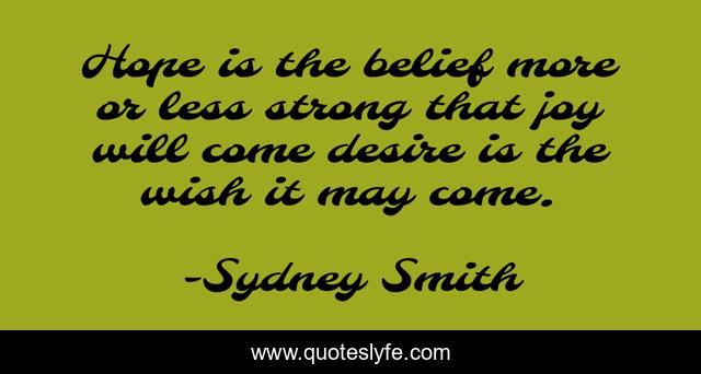 This page presents the quote "Hope is the belief more or less strong that joy will come desire is the wish it may come.". Author of this quote is Sydney Smith. .