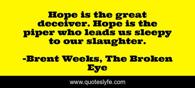 This page presents the quote "Hope is the great deceiver. Hope is the piper who leads us sleepy to our slaughter.". Author of this quote is Brent Weeks, The Broken Eye. This quote is about death, deception, lead, deceiver, piper, sleepy, slaughter, mislead, lull,.