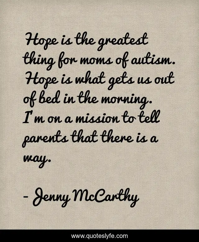 This page presents the quote "Hope is the greatest thing for moms of autism. Hope is what gets us out of bed in the morning. I'm on a mission to tell parents that there is a way.". Author of this quote is Jenny McCarthy. This quote is about parents, greatest, morning,.