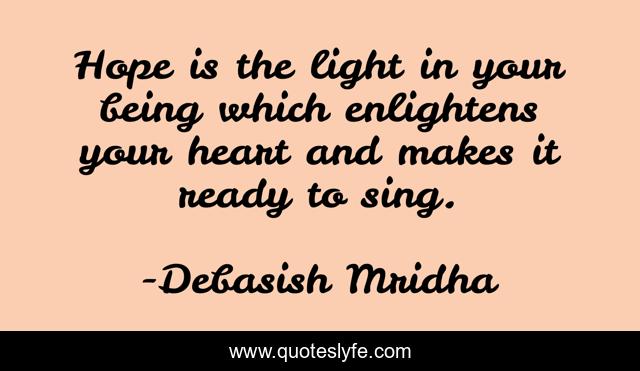 This page presents the quote "Hope is the light in your being which enlightens your heart and makes it ready to sing.". Author of this quote is Debasish Mridha. This quote is about philosophy, inspirational, hope-makes-your-heart-sing, debasish-mridha, quotes, debasish-mridha-md, what-is-hope, enthusiasm, hope,.