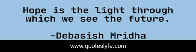 This page presents the quote "Hope is the light through which we see the future.". Author of this quote is Debasish Mridha. This quote is about life, love, knowledge, inspirational, intelligence, philosophy, wisdom, affection, truth,.