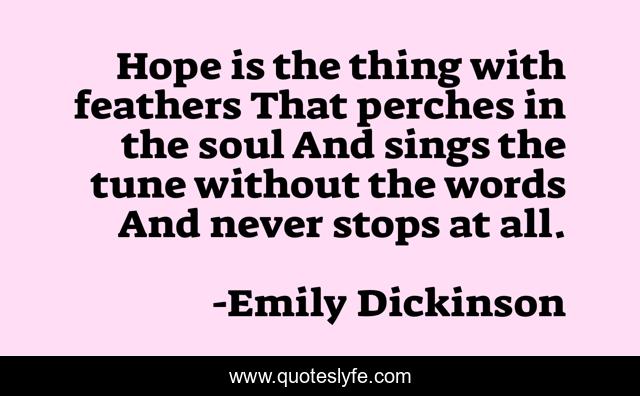 This page presents the quote "Hope is the thing with feathers That perches in the soul And sings the tune without the words And never stops at all.". Author of this quote is Emily Dickinson. .