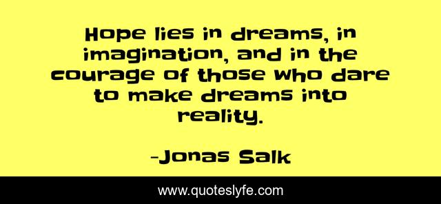 This page presents the quote "Hope lies in dreams, in imagination, and in the courage of those who dare to make dreams into reality.". Author of this quote is Jonas Salk. This quote is about imagination, courage, dreams,.