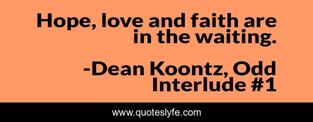 This page presents the quote "Hope, love and faith are in the waiting.". Author of this quote is Dean Koontz, Odd Interlude #1. This quote is about faith, love, odd-thomas, waiting, future, affection, hope,.