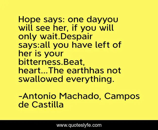 This page presents the quote "Hope says: one dayyou will see her, if you will only wait.Despair says:all you have left of her is your bitterness.Beat, heart…The earthhas not swallowed everything.". Author of this quote is Antonio Machado, Campos de Castilla. This quote is about despair, hope,.