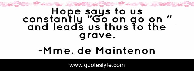 This page presents the quote "Hope says to us constantly "Go on go on " and leads us thus to the grave.". Author of this quote is Mme. de Maintenon. .