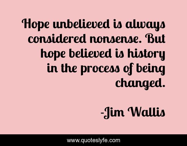 This page presents the quote "Hope unbelieved is always considered nonsense. But hope believed is history in the process of being changed.". Author of this quote is Jim Wallis. This quote is about process, always, history,.