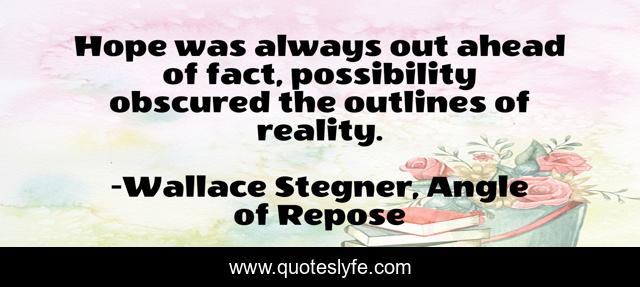 This page presents the quote "Hope was always out ahead of fact, possibility obscured the outlines of reality.". Author of this quote is Wallace Stegner, Angle of Repose. .