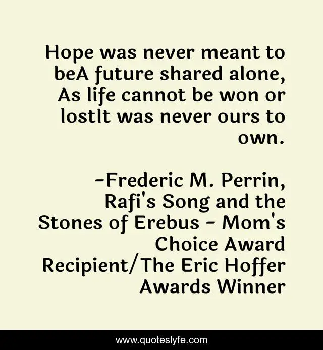 This page presents the quote "Hope was never meant to beA future shared alone, As life cannot be won or lostIt was never ours to own.". Author of this quote is Frederic M. Perrin, Rafi's Song and the Stones of Erebus - Mom's Choice Award Recipient/The Eric Hoffer Awards Winner. This quote is about fantasy, young-adult, young-adult-fantasy,.