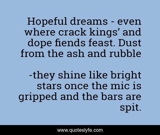 "they shine like bright stars once the mic is gripped and the bars are spit. Quotes." Quoteslyfe.com, 2025. Sun. 07 Dec. 2025. <https://www.quoteslyfe.com/quote/Hopeful-dreams-even-where-crack-kings-and-178288>.