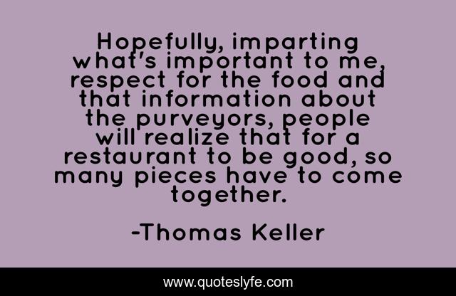 This page presents the quote "Hopefully, imparting what's important to me, respect for the food and that information about the purveyors, people will realize that for a restaurant to be good, so many pieces have to come together.". Author of this quote is Thomas Keller. This quote is about food, good, together,.