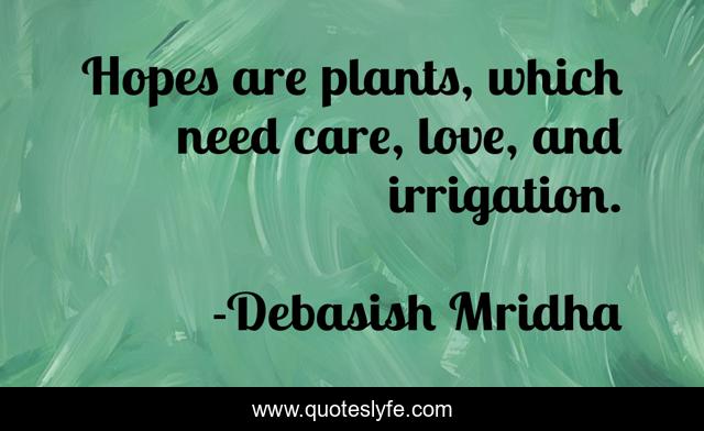 This page presents the quote "Hopes are plants, which need care, love, and irrigation.". Author of this quote is Debasish Mridha. This quote is about life, love, knowledge, inspirational, intelligence, philosophy, wisdom, affection, truth,.