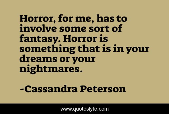 This page presents the quote "Horror, for me, has to involve some sort of fantasy. Horror is something that is in your dreams or your nightmares.". Author of this quote is Cassandra Peterson. This quote is about your dreams, me, fantasy,.