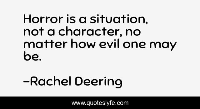 This page presents the quote "Horror is a situation, not a character, no matter how evil one may be.". Author of this quote is Rachel Deering. This quote is about good, horror, character, evil, terror, situation, fear, horrifying, scared,.