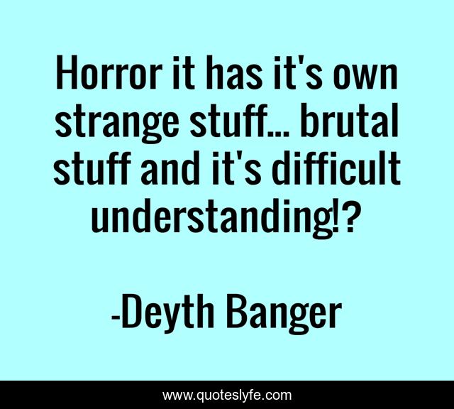 This page presents the quote "Horror it has it's own strange stuff... brutal stuff and it's difficult understanding!?". Author of this quote is Deyth Banger. This quote is about horror, strange, brutal, understanding, stuff, difficults,.