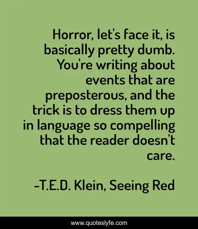 This page presents the quote "Horror, let's face it, is basically pretty dumb. You're writing about events that are preposterous, and the trick is to dress them up in language so compelling that the reader doesn't care.". Author of this quote is T.E.D. Klein, Seeing Red. This quote is about genre, horror,.