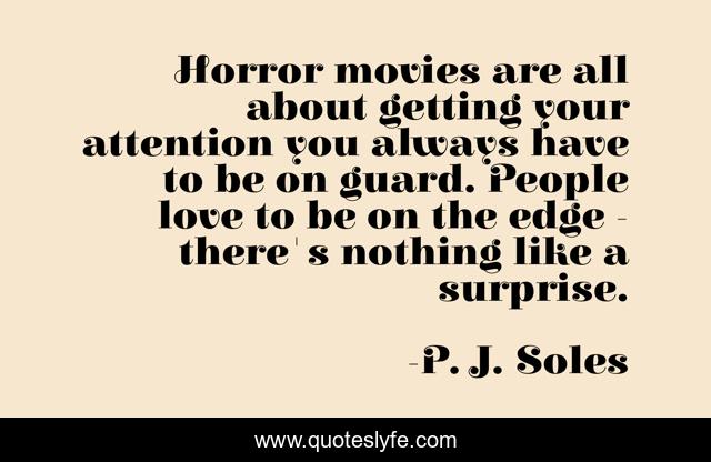This page presents the quote "Horror movies are all about getting your attention you always have to be on guard. People love to be on the edge - there's nothing like a surprise.". Author of this quote is P. J. Soles. This quote is about surprise, love, affection, people,.