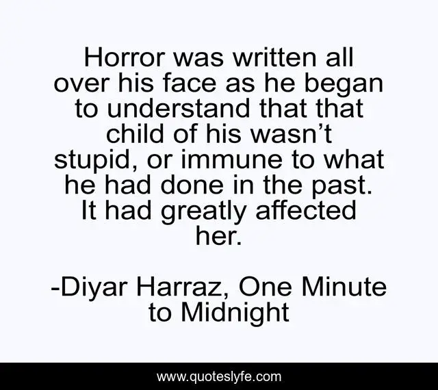 This page presents the quote "Horror was written all over his face as he began to understand that that child of his wasn’t stupid, or immune to what he had done in the past. It had greatly affected her.". Author of this quote is Diyar Harraz, One Minute to Midnight. This quote is about life-and-living, mistakes-we-make,.