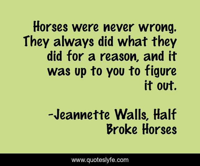 This page presents the quote "Horses were never wrong. They always did what they did for a reason, and it was up to you to figure it out.". Author of this quote is Jeannette Walls, Half Broke Horses. This quote is about horses, reasons, life, animals, choices,.