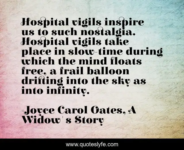 This page presents the quote "Hospital vigils inspire us to such nostalgia. Hospital vigils take place in slow-time during which the mind floats free, a frail balloon drifting into the sky as into infinity.". Author of this quote is Joyce Carol Oates, A Widow's Story. .