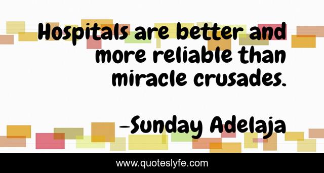 This page presents the quote "Hospitals are better and more reliable than miracle crusades.". Author of this quote is Sunday Adelaja. This quote is about miracles, inspiritional, miracle, insoiration,.