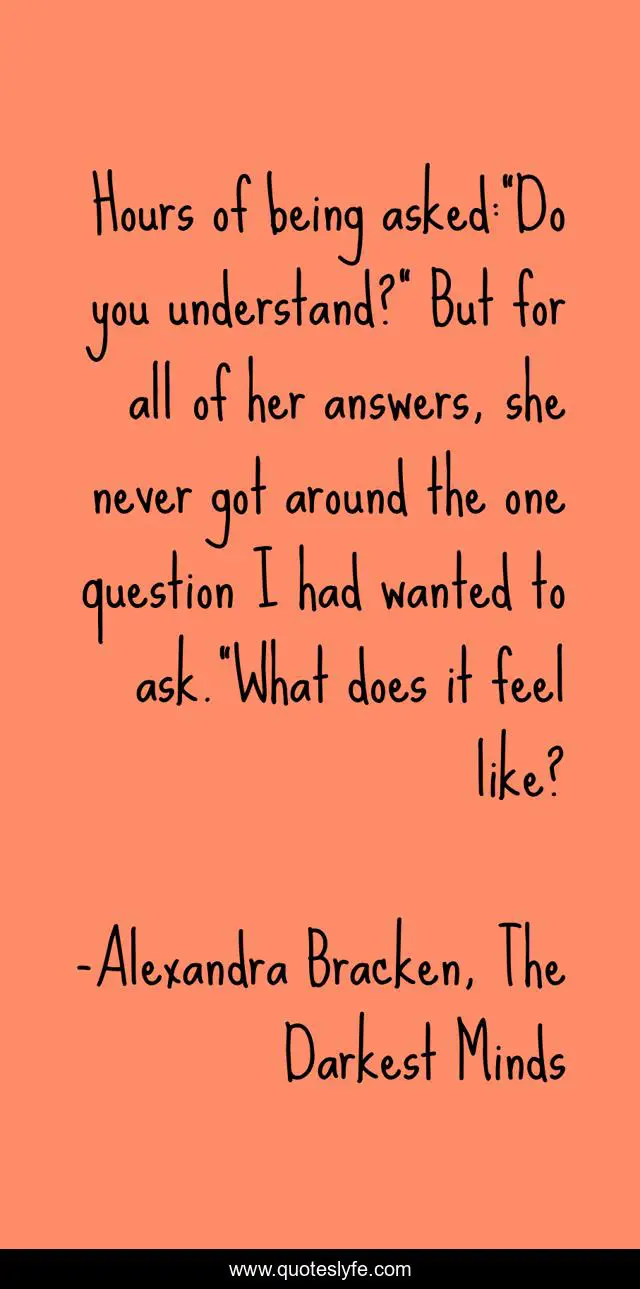 This page presents the quote "Hours of being asked:"Do you understand?" But for all of her answers, she never got around the one question I had wanted to ask."What does it feel like?". Author of this quote is Alexandra Bracken, The Darkest Minds. .