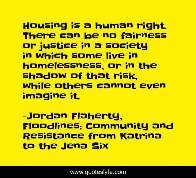 "Jordan Flaherty, Floodlines: Community and Resistance from Katrina to the Jena Six Quotes." Quoteslyfe.com, 2025. Fri. 05 Dec. 2025. <https://www.quoteslyfe.com/quote/Housing-is-a-human-right-There-can-174276>.