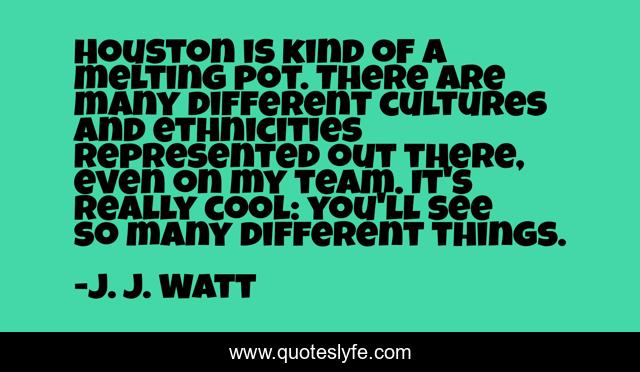 This page presents the quote "Houston is kind of a melting pot. There are many different cultures and ethnicities represented out there, even on my team. It's really cool: you'll see so many different things.". Author of this quote is J. J. Watt. This quote is about see, team,.
