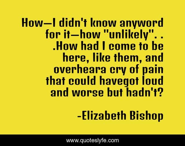 This page presents the quote "How—I didn't know anyword for it—how "unlikely". . .How had I come to be here, like them, and overheara cry of pain that could havegot loud and worse but hadn't?". Author of this quote is Elizabeth Bishop. This quote is about poem, poetry, human, poet, humanity, elizabeth-bishop,.