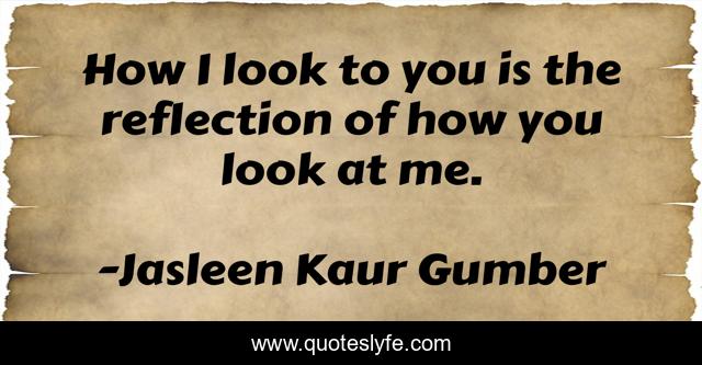 This page presents the quote "How I look to you is the reflection of how you look at me.". Author of this quote is Jasleen Kaur Gumber. This quote is about life, perception, love, reflection, philosophy, wisdom, behaviour, attitude, world,.